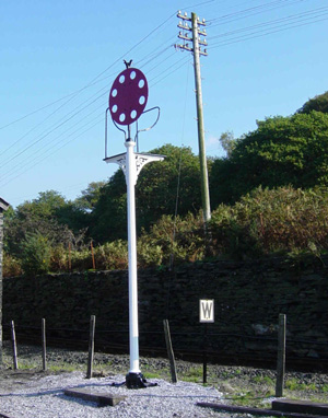 Disc signals were used on the Festiniog from the mid-19th century until the 1920s. Although falling out of use, a number survived and have been slowly repaired and reassembled. Those with sharp eyes will be able to spot them outside the old loco shed at Boston Lodge and in the field by the entrance to Minfford yard. However the easiest to spot is on the Cob, now returned to use as a fixed distant signal as you near Porthmadog, where trains will whistle twice to warn the signalman of their approach.